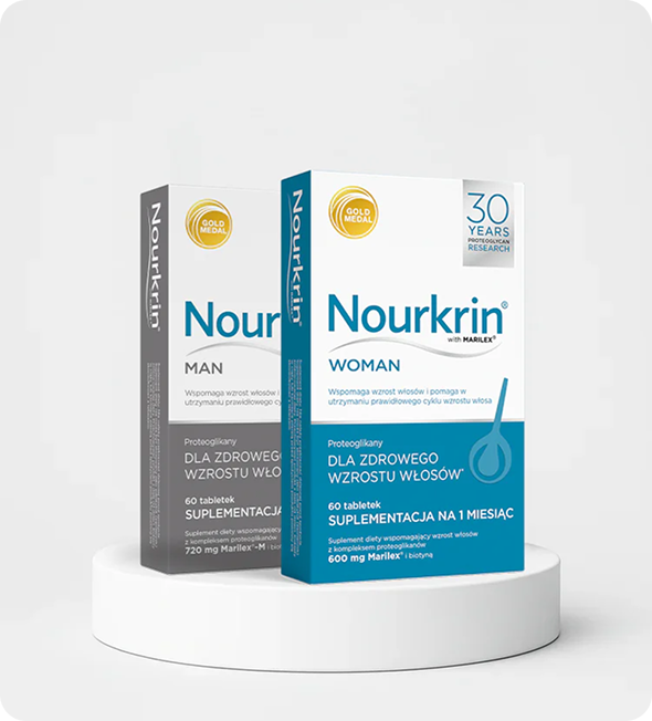Formuła Nourkrin® z Marilex®, oparta na bioaktywnych proteoglikanach, działa dokładnie tam, gdzie zaczyna się problem – w mieszku włosowym. Poprawia jego naturalną zdolność do regeneracji i wzrostu.